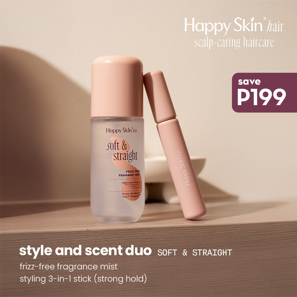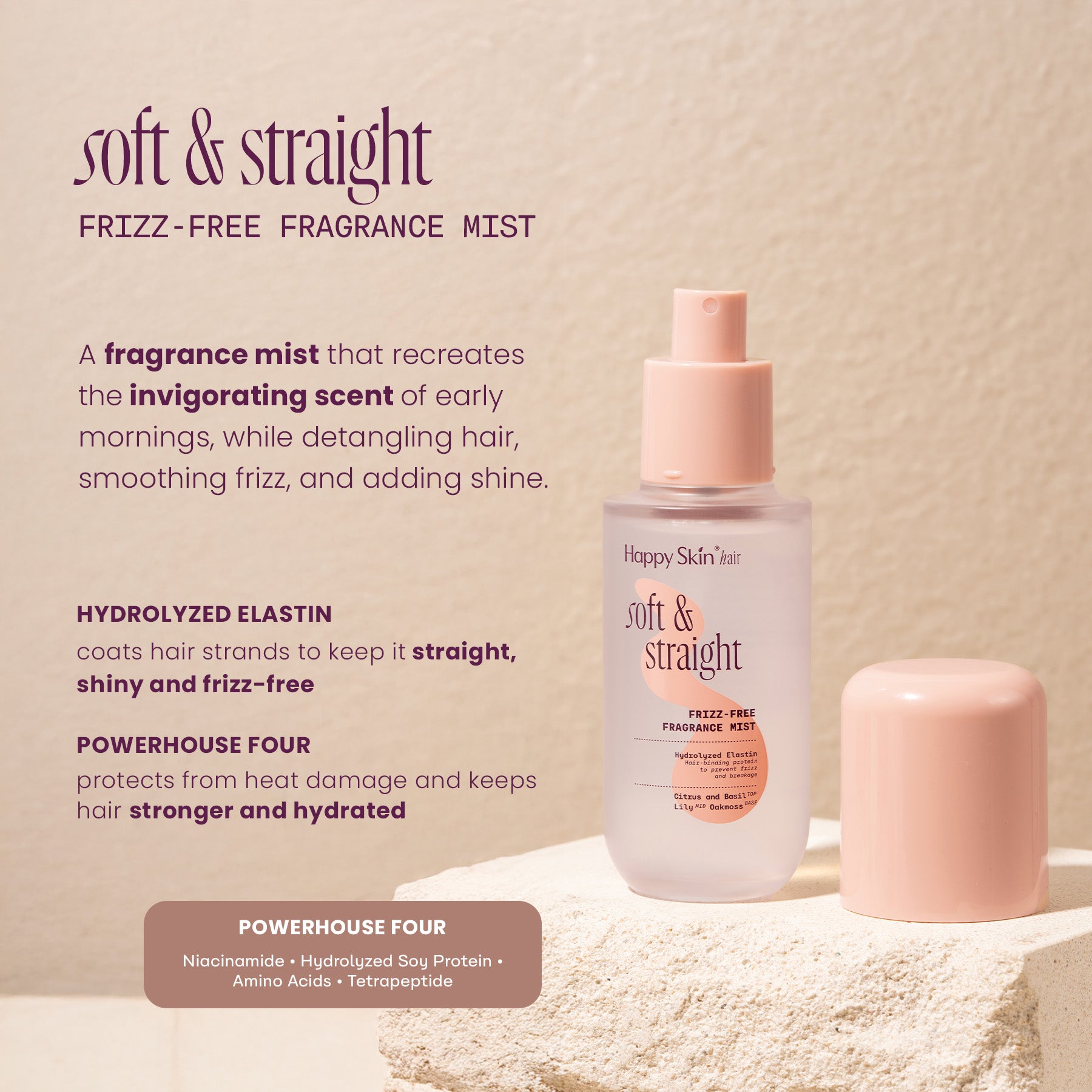 The perfect spritz to reset and refresh your hair, the Happy Skin Hair Soft & Straight Frizz-Free Fragrance Mist makes detangling and styling a breeze while smoothing strands and adding shine. It’s infused with a fresh, vibrant blend of zesty Citrus, crisp Basil, dewy Lily, and earthy Oakmoss—like a fresh and invigorating walk through nature, leaving your hair smelling good and looking polished in seconds.