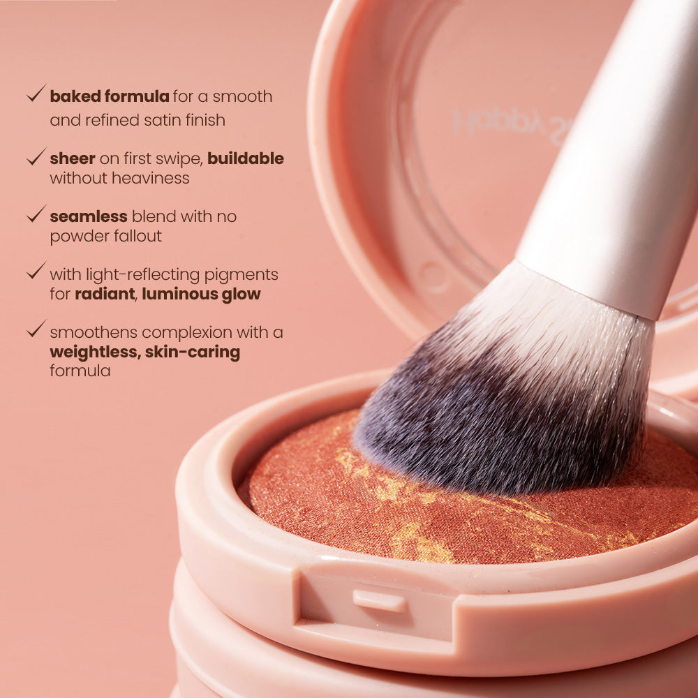 Using a brush, apply blush on your cheeks and on the high points of your face for a soft, natural-looking flush. Layer for a more vibrant, high-impact glow.